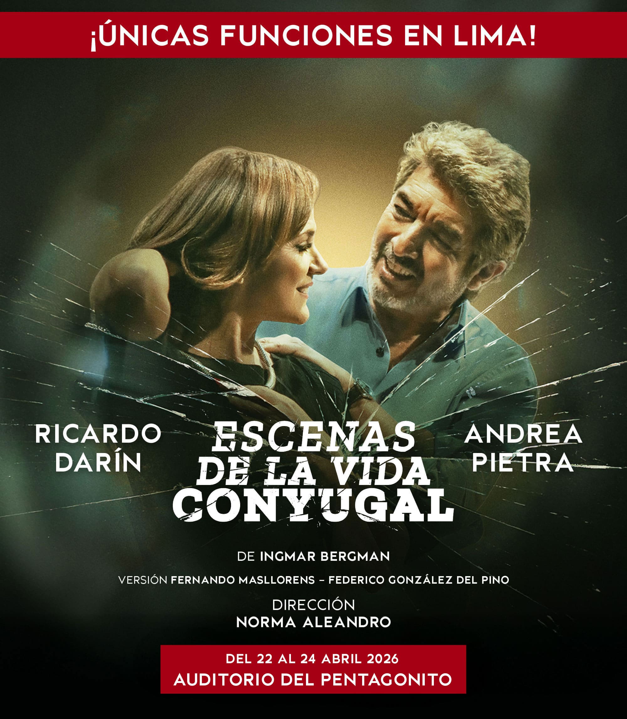 - * 10% DSCTO. BBVA: Descuento exclusivo desde el 06 de marzo de 2026 hasta agotar stock. 10% de descuento en las entradas a Escenas de una vida Conyugal, una obra de Ricardo Darin para pagos con Tarjeta de Crédito y Débito BBVA. Stock 170 entradas por función, distribuidas de la siguiente manera: PLATINUM (20), GOLD (20), VIP (30), PREFERENCIAL (30), MEZZANINE (30), MEZZANINE (40). Válido para compras online en https://teleticket.com.pe/escenas-de-una-vida-conyugal Precios publicados en la web de Teleticket. Funciones y lugar de evento: 22, 23 y 24 de abril de 2026 en el Auditorio del Pentagonito, Lima. Compra máxima por persona: 04 entradas. Una producción de MASNOU REPRESENTACIONES SAC. RUC: 20550305454. Los precios incluyen comisión de ticketera e impuestos de ley. El desarrollo del evento es responsabilidad del organizador, BBVA actúa como intermediario, por lo que no tendrá responsabilidad legal por cualquier daño o perjuicio, así como cualquier eventualidad que impida la realización.